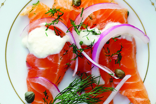 Pat salmon dry and place in a non-reactive bowl. In a separate bowl, combine the gin, lemon zest, orange zest, dill, maple syrup and salt in a bowl. Pour marinade over the salmon fillets and refrigerate for 6 to 8 hours. While the salmon is curing, make a quick sauce by combining the horseradish, sour cream, lemon juice and orange in a bowl. Mix until well combined. When ready to serve, brush excess salt and curing mixture off salmon. Remove the skin from the salmon and using a very sharp knife, cut the salmon into thin slices. Place salmon on plates topped with sliced red onion, and capers. Serve pumpernickel bread and sauce on the side along with chilled gin.