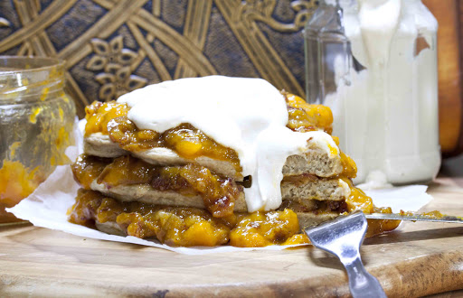 Layer the pancakes with the jam then add a big dollop on the top of the last layer of jam. You could also add cream between each layer for extra creamy goodness.