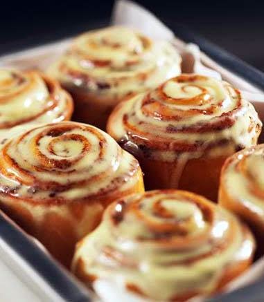 Then roll out on floured board to 34 x 21" size. Take 1 cup soft butter and spread over surface. In bowl, mix 2 cups brown sugar and 4 teas. cinnamon. Sprinkle over top. Roll up very tightly. With knife, put a notch every 2". Cut with thread or knife.