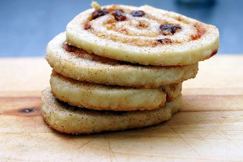 Slice chilled dough logs crosswise, about 1/4 inch thick. Toss each cookie in the cinnamon-sugar mixture. Place cookies 3 inches apart on prepared baking sheets. Bake until lightly browned, 18 to 20 minutes. Lift parchment paper from baking sheets and transfer to a wire cooling rack; let cool.