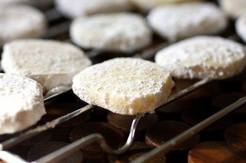 4. Heat oven to 350 degrees. Line two baking sheets with parchment. Place remaining 2/3 cup sugar in a resealable plastic bag. Remove parchment from logs; slice dough into 1/4-inch-thick rounds. Place rounds on baking sheets, spaced 1 inch apart.