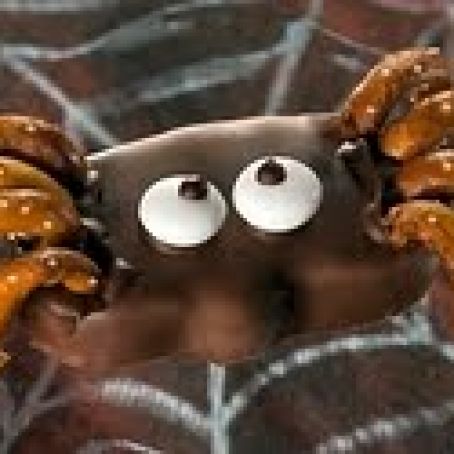 3. For each spider, place peanut butter pumpkin on prepared tray. Attach pretzel legs and white eyes to spider with melted chocolate; place dot of melted chocolate on each eye. Allow chocolate to set before moving spiders.