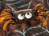 1. Line tray or cookie sheet with waxed paper. Remove wrappers from desired number of peanut butter pumpkins. For each spider, cut 8 matching curved sections from pretzels which will form the legs. Set aside remaining pretzels pieces.