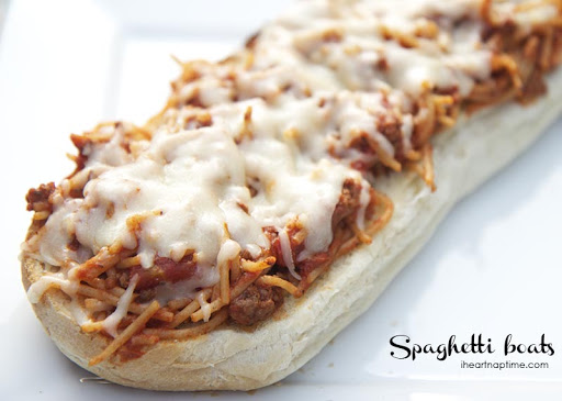 5. Top each piece of bread with about 1 cup of spaghetti. Then sprinkle on 1/2 cup of mozzarella cheese. Bake for additional 5 minutes or until cheese is nice and bubbly.