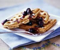 3. Pour 1 cup of the batter onto grids of a preheated, lightly greased waffle iron. Close lid quickly; do no open lid until waffle is done. Bake according to manufacturer's directions. When done, use a fork to lift waffle off grid. Repeat with remaining batter. Serve waffles with Blueberry Sauce. Makes 8 servings (16 waffles).