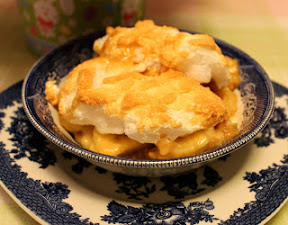 Spread the meringue over the pudding, making sure to seal it to the edges of the dish all the way around. That just means to not leave any air pockets or gaps around the edges. When your meringue shrinks back or pulls away from the sides or sinks in the middle, it's because you have not 'sealed' it to the edges and have left spaces open. Place in a 350 degree oven for about 8-10 minutes or until it just starts to brown. Watch it carefully!