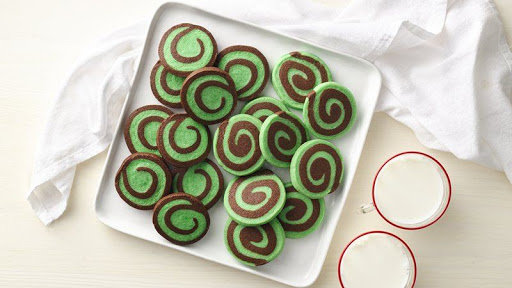 1.In large bowl, stir cookie mix, butter and egg until dough forms. Divide dough in half. Stir cocoa into one half. Stir flour, mint extract and food color into other half. Place chocolate dough on 17x12-inch sheet waxed paper. Top dough with second sheet of waxed paper. Roll dough to form 12x7-inch rectangle. Repeat with green colored dough.