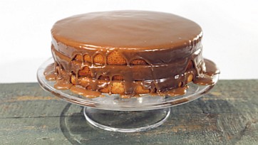 7)Remove from heat, allow to cool completely. Transfer caramel mixture to the bowl of an electric mixer. Add the powdered sugar. With the whisk attachment, whisk until combined and smooth. Pour over each layer of the cake. Let the frosting drip over the sides to cover. Allow to harden.