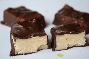 7.Once solid, lift the whole chunk out by lifting the paper. Cut into desired shapes. Dip each piece in the chocolate, letting the excess drip back before laying it on A Silpat, parchment, or waxed paper to solidify. Store in an airtight container on the counter or in the freezer. Unlike most coconut oil delicacies, these are solid at room temp and travel well out of refrigeration, at least here in the cooler NW!