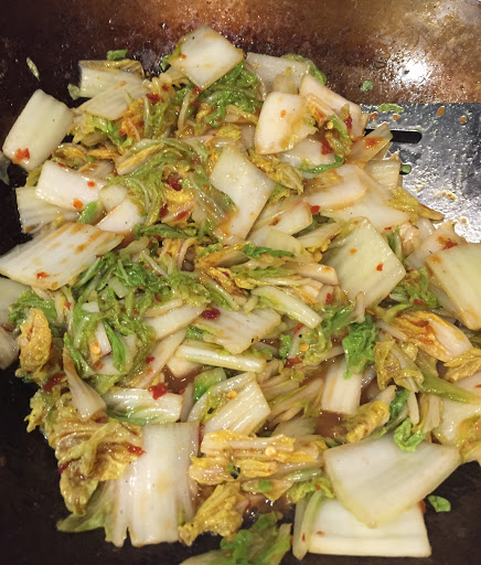 1. In a wok, stir-fry half the napa in oil for 3 minutes.