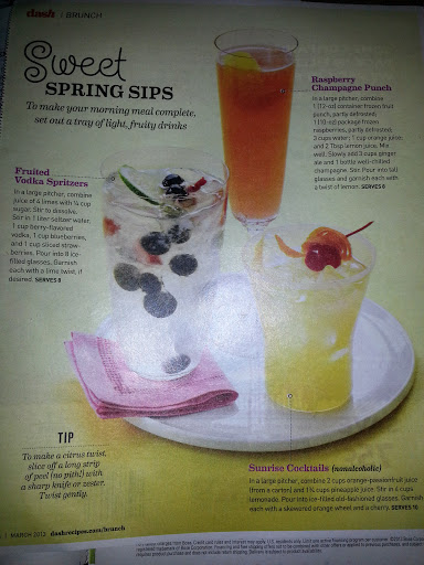 Drinks in photo clockwise: Raspberry Champagne Punch; Sunrise Cocktails; Fruited Vodka Spritzer