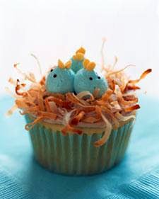 Lightly frost cupcakes with 1 cup chocolate buttercream; set aside. Tint 2 tablespoons reserved buttercream pale yellow; place in a pastry bag fitted with a #349 Ateco leaf tip; set aside. Tint remaining buttercream light blue; place in a pastry bag fitted with a #11 Ateco plain round tip, and pipe three bluebird heads, 3/4 inch in diameter, onto each cupcake. Using leaf tip, pipe yellow beaks. With a toothpick, add melted-chocolate eyes. Form each nest with 2 tablespoons toasted coconut.