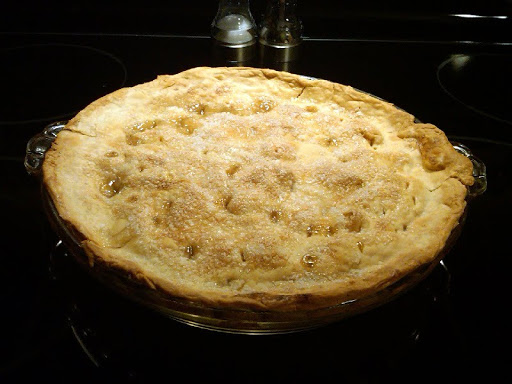 Prepare pie dish with pie crusts. Pour mixture in crust. Cover with other crust and seal edges. Cut slits with knife on top of pie. Sprinkle lightly with water, to dampen top crust and then sprinkle with sugar. Bake