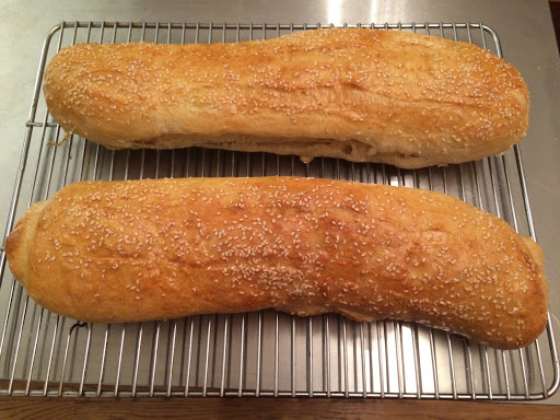 Split into two loaves and roll out on floured surface. Roll into long loaf and brush with egg wash (sprinkle with sesame seeds optional). You can also cut and shape for dinner rolls or make great hoagie rolls.