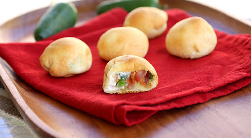 Place 1-2 teaspoons of cream cheese on each roll and top with a teaspoon of diced jalapeno and a teaspoon of crumbled bacon.