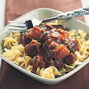In large, heavy coquette-type pot, saute the musshrooms and the onions in the butter until brown. Remove and set aside. Add the bacon and fry, remove and set aside. Fry steak in bacon fat, stirring frequently, until well browned. Return mushrooms, onions and bacon to pot with steak and add flour, tossing until it disappears. Add wine, broth, bay leaf, garlic and thyme. Simmer, covered, for 30 minutes, stirring frequently.