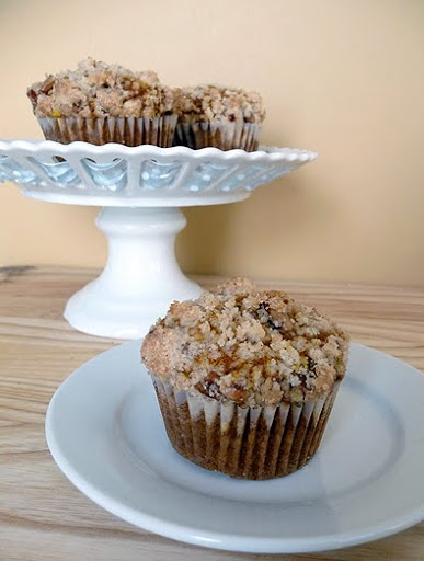 9. Sprinkle the pecan streusel on top of each muffin. Press on the streusel lightly to make sure it adheres to the batter.