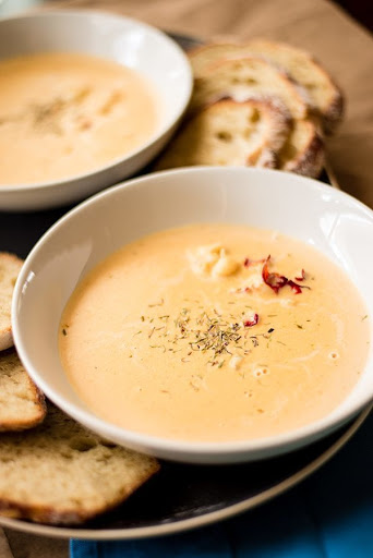 Blend the mixture in a blender or using an immersion blender. The mixture should be very smooth. Return the blended mixture to the pan and add in the heavy cream and butter. Taste at this time to check if any additional salt or pepper is needed. Bring the mixture to a simmer.