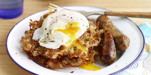 Spray waffle maker with nonstick cooking spray and add 1/2 inch layer of potatoes per waffle. Close waffle maker, pressing down firmly. Cook 12 minutes or until deep golden brown and crisp. Keep warm on cookie sheet in a 225 degree F oven. Repeat with remaining potato mixture. Serve with poached eggs and sausage.