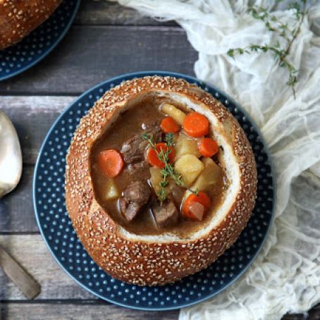 This particular beef stew recipe is certainly not the most traditional or the most minimal, but it does pay homage to its roots with plenty of potatoes. The Guinness adds a nutty, dark seasoning and it keeps the meat tender and moist. The fresh herbs, onion and garlic ensure a broth that is rich in flavor, and the carrots and parsnips add some variety and heartiness. The results are a rich and tender stew whose taste is only further enhanced by the crusty bread bowls that it is served in.