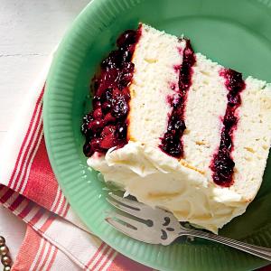 3. Place 1 Basic White Cake layer on a serving platter. Spoon 1 1/2 cups buttercream into a zip-top plastic freezer bag. Snip 1 corner of bag to make a small hole. Pipe a ring of frosting around cake layer just inside the top edge. Spread cake layer with half of chilled Cranberry Filling (without whole berries), spreading to edge of piped frosting. Top with second cake layer. Repeat procedure with frosting and remaining Cranberry Filling (without whole berries). Top with third layer. Spread remaining buttercream over top and sides of cake. Pipe a ring of frosting around top cake layer just inside the top edge. Spread Cranberry Topping (with whole berries) over top cake layer, spreading to edge of piped frosting.