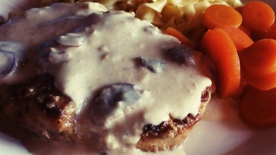 Season pork chops with salt, pepper, and garlic powder, and then dredge in 1/2 cup flour. In a skillet over medium heat, lightly brown chops in a small amount of oil.