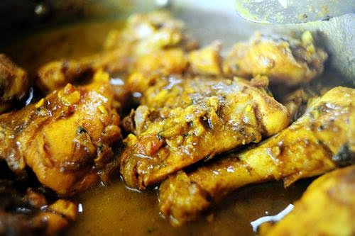 When the curry slurry has become a thick paste, chop the other half of the onion and add it in. Allow the onions to soften, then add in the chicken. Stir to coat the chicken, then cook, half covered, for five minutes. Turn the chicken, then add in 1 to 2 cups of water. Shake the pan and allow the chicken to cook until done, stirring every five minutes. Cook for about 20 to 15 minutes. At the end, be sure to taste and adjust salt and pepper.