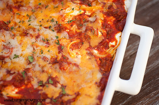 In a medium bowl, mix together the cooked beef and spaghetti sauce.
