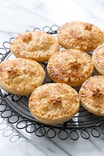 Bake pies at 425 degrees for 15 minutes, then reduce oven temperature to 350 degrees F. Rotate baking sheets top to bottom. Bake for 10 more minutes or until crusts are puffed and deep golden brown. Remove from oven and let cool for 5 minutes before serving warm.