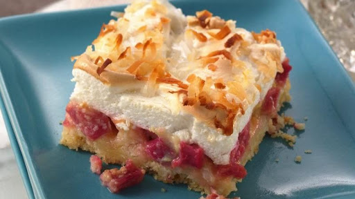 3. Beat egg whites in medium bowl with electric mixer on high speed until foamy. Beat in 1/3 cup sugar, 1 tablespoon at a time; continue beating until stiff and glossy (do not underbeat). Beat in vanilla. Spread over rhubarb mixture; sprinkle with coconut. Bake about 10 minutes or until light brown; cool about 30 minutes. Cut into about 3-inch squares.