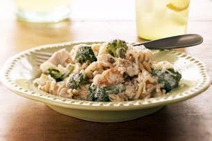DRAIN pasta and broccoli. Add to chicken mixture; mix lightly. Spoon into 8-inch sq. baking dish; cover.