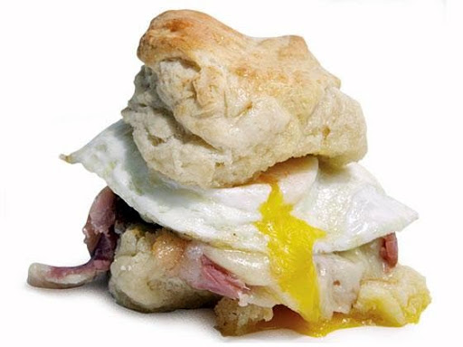 Cut each biscuit in half horizontally. Lay the halves, cut side up, on a work surface. For each sandwich, place 1/2 ounce cheese on the bottom half of biscuit, the top with 2 fried eggs, 2 slices of ham and 1/2 ounce cheese. Cover with top half of biscuit.
