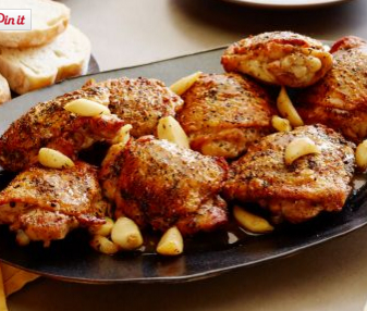 Add the garlic back to the pan and place hot pan in oven. Bake the chicken until cooked through, about 25 minutes. Once the chicken is done, remove chicken thighs and garlic to a platter.
