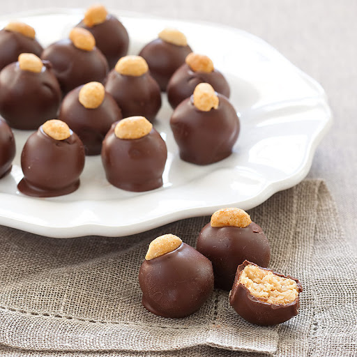 3. Using toothpick, pick up 1 ball and dip into chocolate to coat, letting excess chocolate drip back into bowl. Return ball to plate, remove toothpick, and immediately place peanut half over toothpick hole. Repeat with remaining balls. Freeze balls, uncovered, until chocolate has hardened, about 10 minutes. Serve, or store in refrigerator until serving time. (Truffles can be refrigerated in airtight container for up to 1 week.)