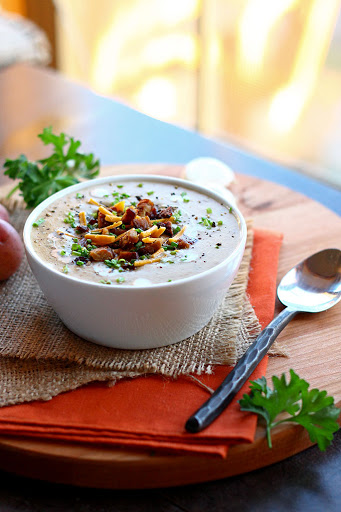 Kid Friendly Step: Garnish each bowl of soup with a drizzle of olive oil and coconut milk, plus 1-2 tbsp each of cheddar, chopped tempeh bacon, and chives. Accompany with fresh crusty bread spread with your favorite vegan butter (like Earth Balance Buttery Spread.)