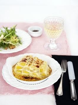 3 Preheat a grill on high heat. Carefully unmould terrine, cut into eight thick slices. Place each slice in an individual 150ml-capacity gratin dish, spoon over sauce and grill until golden (3-5 minutes). Serve immediately with frisée, walnut and Roquefort salad.
