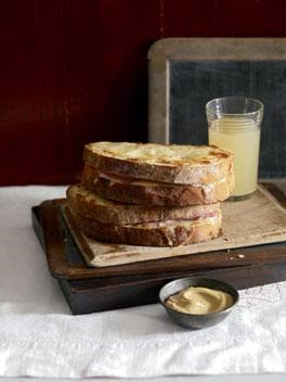 Preheat oven to 180C. Combine Gruyère, crème fraîche and mustard in a bowl, season to taste, mix well. Spread thickly over bread slices, then top half the bread slices with ham. Top with remaining bread slices, cheese-side up, and set aside.
