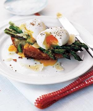 Divide the asparagus among the toast, sprinkle on the Parmesan, and top with the eggs.
