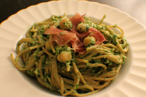 Cook pasta according to package directions. Meanwhile, drain and rinse chickpeas and set aside. Pulse arugula, olive oil, garlic, Parmesan, and salt/pepper in food processor to form “pesto”. In a small bowl, combine pasta, pesto, chickpeas and ricotta. Add lemon and salt and pepper to taste. Top with prosciutto, bacon, fried egg, or whatever else you might have on hand and enjoy!