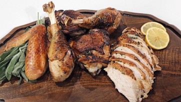 In a medium bowl, add the butter, parsley, sage, garlic, lemon zest, crushed red pepper flakes, Kosher salt and mix to combine. Rub spicy gremolata under the skin on each part.