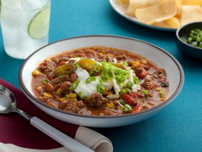 Brown the ground beef and onions in a large skillet; drain the excess fat, then transfer the browned beef and onions to a large slow cooker or a stockpot. Add the beans, corn, tomatoes, green chiles, black olives, green olives, taco seasoning, and ranch dressing mix, and cook in a slow cooker on low for 6 to 8 hours or simmer over low heat for about 1 hour in a pot on the stove. To serve, place a few corn chips in each bowl and ladle soup over them. Top with sour cream, cheese, green onions and jalapenos.
