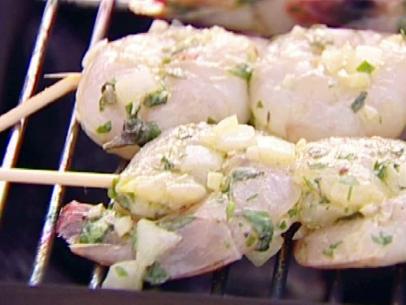 Prepare a charcoal grill with hot coals, and brush the grilling rack with oil to prevent the shrimp from sticking. Skewer the shrimp on 6-inch skewers and grill for 1 1/2 minutes on each side.