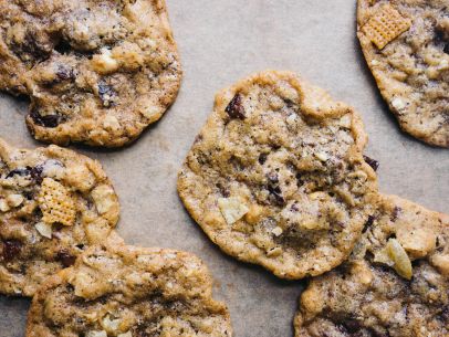 In a medium bowl, whisk together the flour, coffee, baking soda and remaining 3/4 teaspoon salt. In a large bowl, using a wooden spoon, mix together the 10 tablespoons room-temperature butter, granulated sugar and brown sugar until creamy. Stir in the egg and vanilla. Then carefully fold in the chocolate, peanuts, sour cherries, potato chips and the oat and Chex mixture. Scoop the dough into 2-tablespoon scoops and roll each one into a neat ball. Freeze the dough balls for at least 1 hour.