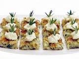 Cut the pancake into 1 1/2-inch squares and arrange on a serving platter. Pipe or spoon the seasoned mascarpone on top and garnish with a few fresh rosemary leaves.