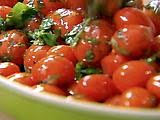 Heat the olive oil in a saute pan large enough to hold all the tomatoes in one layer. Add the garlic to the oil and cook over medium heat for 30 seconds. Add the tomatoes, basil, parsley, thyme, salt, and pepper. Reduce the heat to low and cook for 5 to 7 minutes, tossing occasionally, until the tomatoes begin to loose their firm round shape. Sprinkle with a little fresh chopped basil and parsley and serve hot or at room temperature.