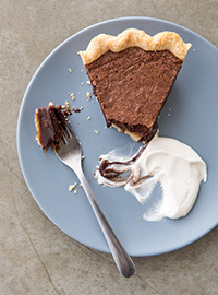 A catchall term for a kind of one-crust custard pie, English settlers brought chess pie to the new world as early as the 17th century. Originating from an archaic English spelling of cheese (“chese”), this word was used to signify the types of curds and custards commonly used in pies. Melted unsweetened chocolate and cream lend richness, while four eggs plus two additional yolks create a silky, creamy texture. Three tablespoons of flour help bind the ingredients for neat slicing. We bake this pie in a 325-degree oven to yield a soft but fully cooked custard with deep chocolate flavor and a golden crust. An even coat of granulated sugar over the pie provides a crunchy textural contrast.
