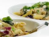 Transfer the penne to serving bowls. Top each portion with the crumbled goat cheese and garnish with basil before serving.