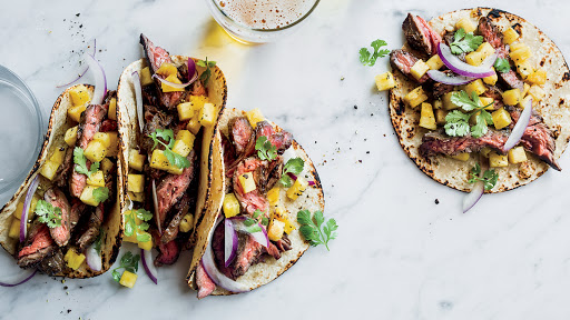 Heat a large cast-iron skillet. Add the steak and cook over high heat, turning once, until charred on the outside and medium-rare within, about 6 minutes. Transfer to a carving board and let rest for 5 minutes. Carve the steak against the grain and serve in warm corn tortillas with diced pineapple, sliced red onion and cilantro leaves.