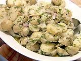 When the potatoes are cool enough to handle, cut them into quarters or halves, depending on their size. Place the cut potatoes in a large bowl and pour enough dressing over them to moisten. (As the salad sits, you may need to add more dressing.) Add the onion, tarragon and parsley, and salt and pepper to taste. Toss well, cover, and refrigerate for a few hours to allow the flavors to blend. Serve cold or at room temperature.
