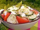 In a large mixing bowl crumble goat cheese. Add tomatoes, cucumbers and onions to bowl. Cut mint leaves chiffonade-style into shreds and add to salad. Add vinegar and olive oil. Mix well. Add salt and pepper, to taste. Refrigerate for 1 hour, then serve.